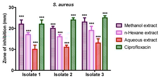 Antibacterial activity of S. diversifolia extracts against S. aureus at 100 μL concentration. ANOVA was applied before Dennett’s post hoc analysis. *** p < 0.001 compared to negative control group.
