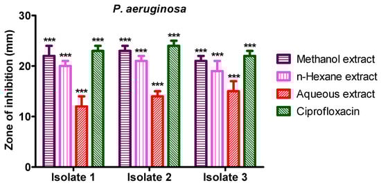 Antibacterial activities of S. diversifolia extract against P. aeruginosa (100 μL). ANOVA was applied before Dennett’s post hoc analysis. *** p < 0.001 compared to negative control group.