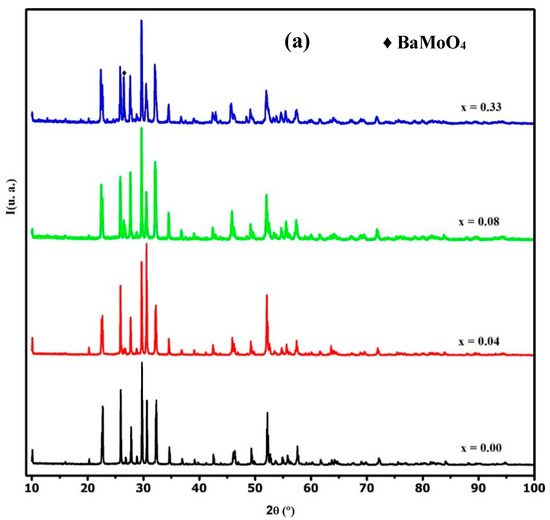 Stretching vibrations of Mo/W/Nb-O bonds were the primary Raman bands within the 840–650 cm−1 region, while the deformation modes of Mo/W/Nb-O bonds were found in the bands between 650 cm−1 and 485 cm−1. The bands in the range of 485–115 cm−1 may have been linked with W/Mo/Nb-O bonds in the octahedra (W/Mo/NbO6) or vibrations of cation translation (Ba2+, Na+). Additionally, according to Shudong Xu et al. [50], the band at 250 cm−1 is attributed to O-Nb-O bending vibrations. The bands located between 280 and 650 cm−1 are related to NbO6-octahedron bending and stretching vibrations. This is similar to the modes observed in LiNbO3 at 248 cm−1 and 628 cm−1 and in Pb2(1−x)K1+xGdxNb5O15 at 260–280 cm−1 and 630–650 cm−1 [51]. In addition, there is a possibility that the highest-frequency mode, in the range of 850–938 cm−1, could be associated with the stretching vibration of (Nb/W/Mo)O6 octahedra, similarly to perovskites [52]. The Raman spectrum of Ba0.54Na0.46Nb1.29W0.37O5 displayed a broad and strong peak at approximately 650 cm−1, as well as another intense peak around 280 cm−1. These peaks are attributed to Nb-O vibrations in the NbO6 octahedra (Figure 3) [44]. Furthermore, from the composition where x = 0.04 with the substitution of W6+ (0.74) with Mo6+ (0.73), the intensity of the Raman peaks at the 280 cm−1 and 650 cm−1 positions increased with increasing MoO3 content. These two Raman peaks are associated with the Nb/W/MoO6 octahedra, and the increasing of their peak intensities can be explained via an increased number of MoO6 octahedra. Furthermore, increasing the MoO6 content in the framework had no effect on the Raman peak positions because the W6+ and Mo6+ ions were the same size and occupied the same sites (Wyckoff 2 and 8). On the other side, few Raman peaks of low intensities were observed from the composition where x = 0.04, and their intensities began to increase as MoO3 content increased; these Raman peaks may be characteristic of the formation of the scheelite-type BaMoO4 composite. Thus, the Raman analysis validated the Rietveld refinement of the X-ray data obtained using the proposed refinement models and verified the presence of a secondary phase (BaMoO4).
