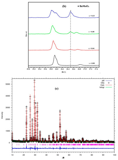 Figure 1a displays the XRD diffractograms of all the examined samples. The XRD pattern of the sample (x = 0) significantly changed as the concentration of Mo6+ increased, as shown in Figure 1b. All examined sample ceramics had very significant diffraction peaks, which suggested that these compounds were well-crystallized. Additionally, all XRD patterns of the prepared ceramics exhibited a tetragonal-type structure. However, it seems that except for (x = 0), the patterns contained a secondary phase: scheelite-type BaMoO4 (barium molybdate). The peak of the index (004) was the characteristic secondary phase located at 2θ position 26.42, which was identified according to JPDS NO: 029-0193. This peak appeared from the ceramic composite where x = 0.04, and it was characterized by low intensity (see Figure 1b). Figure 1c–e display the X-ray diffractograms of the samples obtained from the Rietveld refinement process. The constituent features of the composites where x = 0.04, x = 0.08, and x = 0.33 were guaranteed by the Rietveld refinement; however, the composite where x = 0.33 was guaranteed to have the properties of both the Ba0.54Na0.46Nb1.29W0.04Mo0.33O5 and purity (BaMoO4) constituents. Each plot displays the parameters derived with the Rietveld refinement. For all compositions, the goodness of fit (GOF), or χ2, parameters were below three, which points to the improved XRD patterns’ high dependability (see Table 1). Furthermore, Rietveld refinement confirmed the tetragonal structure of a similar TTB phase with the P4bm space group and a minor BaMoO4 impurity peak (marked with ♦) (see Figure 1b). As opposed to this, the ferroelectric phase and the P4bm space group created a similar TTB structure. G. Yanalak et al have already provided in-depth descriptions of the BaMoO4 phase [48]. A structure of this type is consistently favored, as it promotes better interaction between the ferroelectric and BaMoO4 phases, consequently leading to a robust microwave dielectric effect in composites [49]. Improvement in the volume of the composites was readily observed as the lattice parameters, a, b, and c, were somewhat raised with rising MoO3 content in the ferroelectric phase. The substitution of W6+ (0.74 Å) with Mo6+ (0.73 Å) [50] led to the formation of the BaMoO4 phase (tetragonal with the I41/a space group). In comparison of the x = 0.00 composite to other composites, the cell parameters and volume increased as the peak intensity of the BaMoO4 composite increased from x = 0.00 to x = 0.33. This variation may be associated with the increase in the content of the BaMoO4 phase in the composites. To ensure the secondary phase would be dependent on the BaMoO4 phase type, the dielectric properties of the current pieces were studied to see how their dielectric permittivity would change with increased BaMoO4 composite (see the dielectric measurements section).