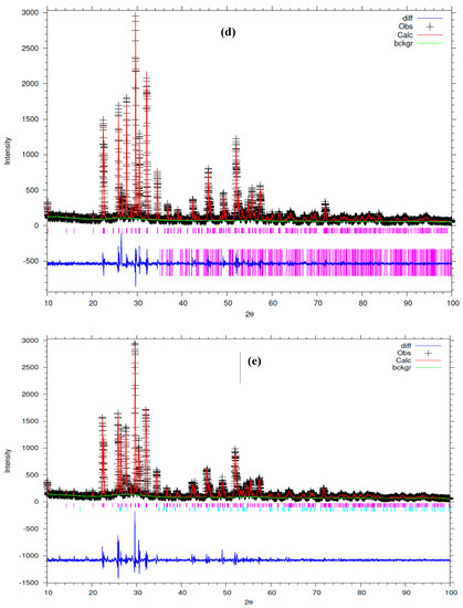 Combined X-ray diffraction patterns (a,b) and Rietveld refinement of Ba0.54Na0.46Nb1.29W(0.37−x)MoxO5 ceramics (x = 0.04 (c), x = 0.08 (d), and x = 0.33 (e)).