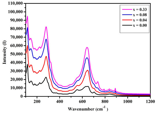 The crystallographic study of the crystalline phases of Ba0.54Na0.46Nb1.29W(0.37−x)MoxO5 (x = 0.04, 0.08, and 0.33) showed that the structures of these ceramics are formed from different bonds, such as Ba/Na-O, Nb/W/Mo-O, and Ba/Na-Nb/W/Mo. The vibration modes of these principal bonds were able to be identified with Raman spectroscopy. As shown in Figure 3, the Raman spectra were recorded between 1200 and 100 cm−1 of these prepared ceramics, characterized by different bands. The identification of these bonds with their bands has been made (see the Table 4) in reference to our previous work focused on crystalline phases (x = 0.0) [44].