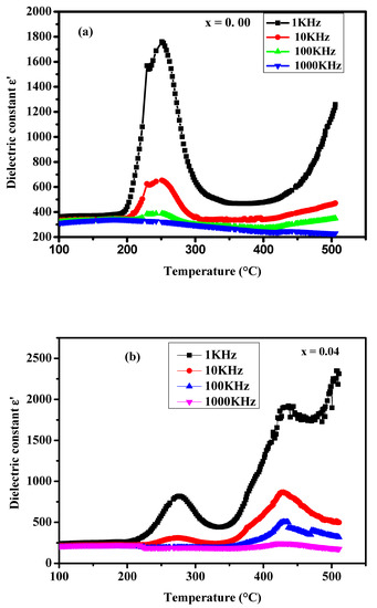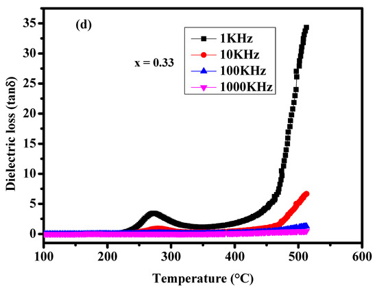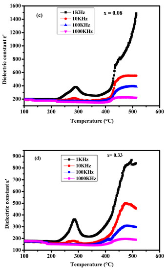 Figure 4a–d depict the thermal evolution of the dielectric permittivity () during heating of different solid-solution compositions (x = 0.00, 0.04, 0.08, and 0.33) at different frequencies.