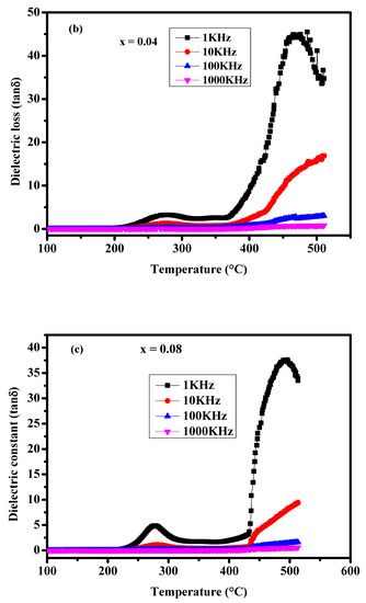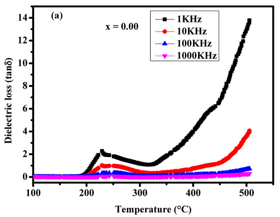 The dielectric losses, , in the ferroelectric phase were reasonably low for all of the compositions examined, as shown in Figure 5a–d. We saw that the losses significantly rose during the paraelectric phase. At low frequencies and high temperatures, this rise was larger. This demonstrates that conductivity plays a vital role at high temperatures [54].