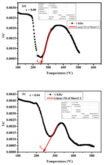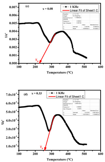 This study focused on analyzing changes in inverse dielectric permittivity with temperature to understand the characteristics of phase transitions. Figure 6a–d depict the variation of the opposite dielectric permittivity versus temperature during heating at a frequency of 1 kHz. The shape of the curve for all of the compositions followed the Curie–Weiss law well in the paraelectric phase defined by Equation (4) [55]: