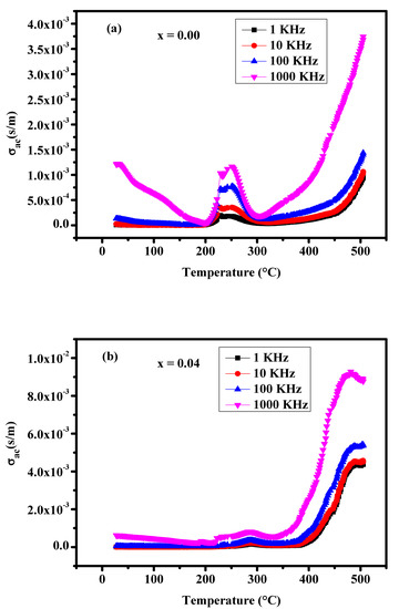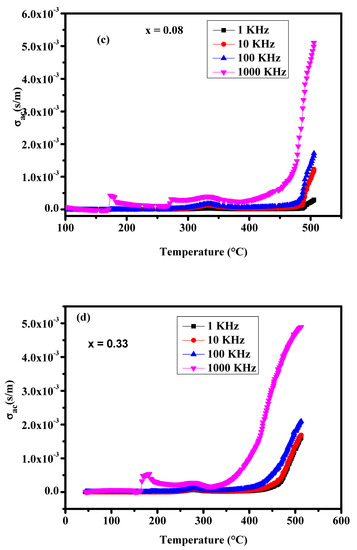 (a–d) Thermal development of electrical conductivity at different frequencies for the ceramics.