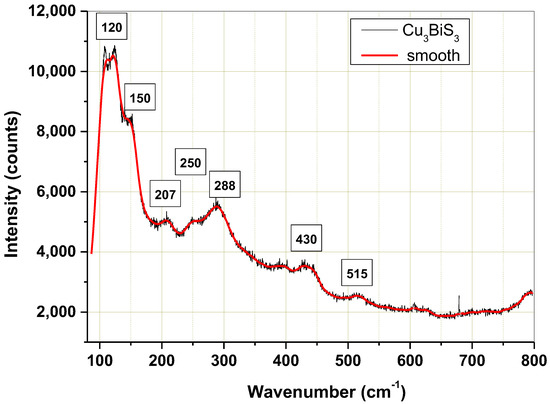 The results of Raman spectroscopy recorded between 80 and 800 cm−1 confirming the crystallinity and structural phase analysis of the prepared Cu3BiS3 sample are shown in Figure 2. The representative micro-Raman spectrum obtained using laser excitation at 514 nm shows modes of 120, 150, 207, 250, 288, 430 and 515 cm−1. The observed modes are close to those of the Cu3BiS3 phase reported in the literature [18,22,39,40,41] and RRUFF database. The measured spectrum from the micro-Raman measurements confirmed that the synthesized Cu3BiS3 is phase pure and the results are in agreement with the measurements obtained from the XRD analysis (Figure 1).