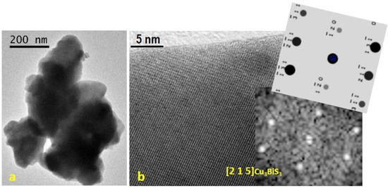 The wittichenite Cu3BiS3 sample was further described by TEM and related techniques. A low-magnification image of the sample is presented in Figure 3a, showing the typical appearance of mechanochemically synthesized samples, where small crystallites are agglomerated, forming large particles. The medium particle size is between 0.5 and 2 µm. A HRTEM study indicates that the nanocrystals can be indexed in an orthorhombic symmetry consistent with the Cu3BiS3 structure (space group P212121 with lattice parameters a = 7.723 Å, b = 10.395 Å and c = 6.716 Å, α = β = γ = 90°), in good agreement with the XRD results. A representative micrograph directed along the [2 1 5]Cu3BiS3 zone axis is shown in Figure 3b and the appropriate FFT and simulated EDP are inset. However, the Cu3BiS3 sample was unstable under the beam irradiation. It was found that small nanocrystallites of Bi2S3 are ejected from the as-received Cu3BiS3 during TEM analysis. This was confirmed by EDX analysis and the results are displayed and described in Figure 4.