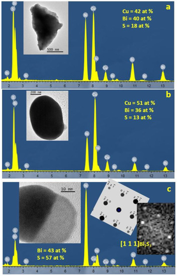 An X-ray spectroscopy (EDX) study was performed to interpret the instability of the sample under the beam irradiation. EDX allowed us to determine the chemical composition of the particles before and after being irradiated, as well as that of the crystallites that were ejected out of the Cu3BiS3 particles. The composition before irradiation (EDX spectrum of a particle, Figure 4a) shows an atomic ratio in accordance with Cu3BiS3 stoichiometry (42 at % of Cu, 18 at % of Bi and 40 at % of S). However, after some minutes of irradiation, the composition changes to 51 at % of Cu, 13 at % of Bi and 36 at % of S (Figure 4b), meaning that the content of Bi and S has decreased, whereas that of Cu has increased. This composition change is due to the ejection of some small Bi2S3 crystallites out of the irradiated particle (see inset in Figure 4b,c). The HRTEM study shows that such crystallites have a structure according to the orthorhombic Bi2S3 (unit cell parameters, a = 11.15 Å, b = 11.30 Å and c = 3.98 Å, α = β = γ = 90° and space group Pbnm). A Bi2S3 nanocrystal oriented along [1 1 1]Bi2S3 is presented in Figure 4c and the corresponding FFT and the calculated EDP are inset.