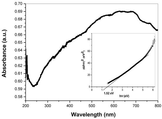 The absorption properties of mechanochemically synthesized wittichenite Cu3BiS3 prepared after 5 min of milling were investigated using UV–Vis absorption microscopy. The measured spectrum in the range from 200 nm to 800 nm, displayed in Figure 6, shows a broad absorption peak with increasing absorbance from 250 nm and a maximum at approximately 670 nm.