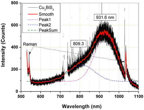 Figure 7 shows the measured micro-PL spectrum obtained upon excitation of the sample with a wavelength of 514 nm. In the spectrum, a broad emission peak is located near 931.6 nm (1.33 eV) with an onset at 809.3 nm (1.53 eV), which agrees with the measured results obtained in a previous report [45]. The values obtained that correspond to the fitted PL Cu3BiS3 peaks are in good agreement with the published bandgap data for bulk Cu3BiS3 (around 1.40 eV) [3].