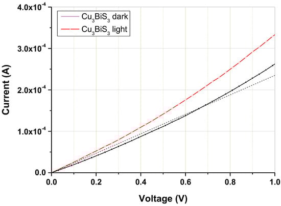 The optoelectrical properties of the Cu3BiS3 powder nanocrystals dispersed on interdigital contacts from solution were verified by measuring the current–voltage (I–V) characteristics in the dark and under focused halogen light illumination. In doing so, we assumed that in the thin dispersed layer on Au fingers, active bridges from the nanopowder will be created in the gaps for the possibility of measuring electrical and optoelectrical parameters. Our measurements were carried out to confirm the fact that the prepared nanocrystalline powder exhibits suitable electrical conductivity and photosensitivity. This was confirmed by the measurement of the current–voltage characteristics, as shown in Figure 8. The I–V characteristics show only a slightly nonlinear dependence on the voltage, which indicates the formation of an acceptable ohmic contact between the Au fingers of the interdigital structure. Under intense illumination, a thin layer of dispersed Cu3BiS3 nanocrystals shows an increase in the current due to the generation of charge carriers, which causes an increase in the photo-responsive current. The generated photo-responsive current shows a 26% increase at 1V compared to the current in the dark for the measured sample.