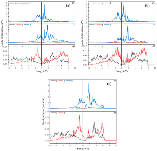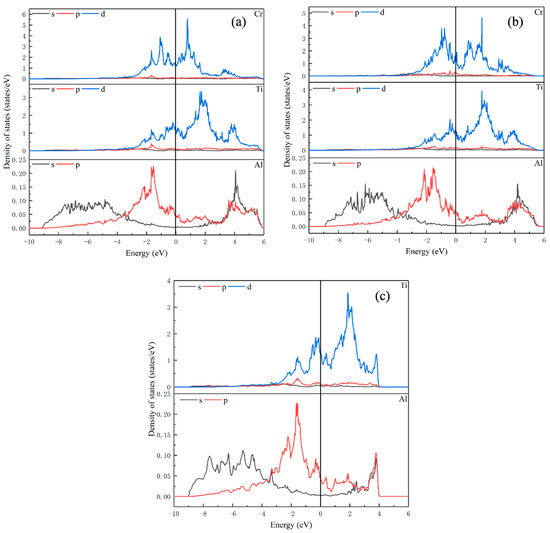 Partial density of states for (a) Ti7Al24Cr; (b) Ti8Al23Cr; (c) Ti8Al24.