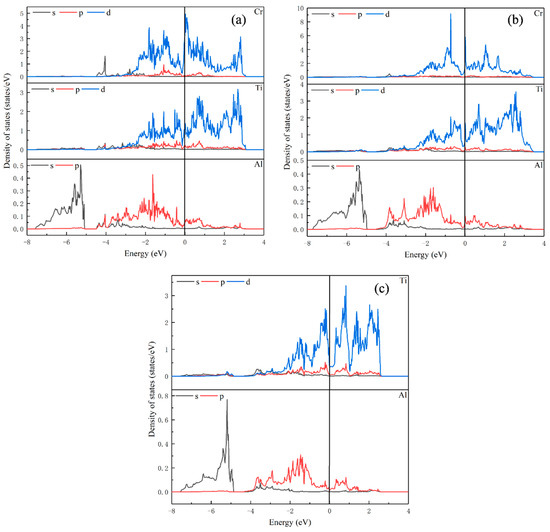 Figure 2, Figure 3 and Figure 4 show the partial density of states data of elements in Ti8Al24, Ti7Al24Cr, Ti8Al23Cr, Ti16Al16, Ti15Al16Cr, Ti16Al15Cr, Ti24Al8, Ti23Al8Cr and Ti24Al7Cr. It can be seen from these figures that the Ti-d-Ti-d interaction is dominant in the Ti-Al intermetallics, and the bonding characteristics are metallic. From Figure 2c, it can be noted that for Ti8Al24, there is an overlap between Al s, Al p and Ti d orbitals from about −2 eV to 5 eV, and there is a low energy weak spd hybrid band. However, the energy is so small that the covalent bonds formed by hybridization between Al and Ti elements are almost negligible. When Cr replaces Ti, the peaks of state density of Ti and Al decrease, and the interactions between Ti-Ti, Ti-Al and Al-Al become weaker. When Cr replaces Al, the peak of the density of states of Ti increases, while Al decreases. The interaction between Ti-Ti is strengthened, and the interaction between Al-Al is weakened.