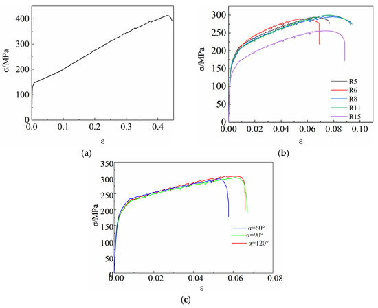 Figure 1. True stress-strain curves of 6061 aluminum alloy sample. (a) Circular arc tensile sample. (b) Arc-shaped notched tension sample. (c) V-shaped notched tensile sample.