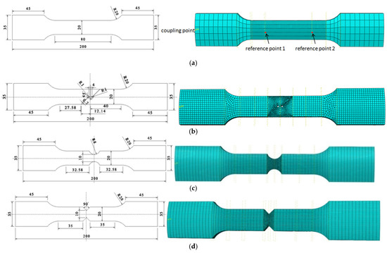 Figure 2. Finite element model of 6061 aluminum alloy tensile samples. (a) Circular arc tensile sample. (b) Shear sample. (c) Arc-shaped notched tension sample R = 8 mm. (d) V-shaped notched tensile sample α = 90°.