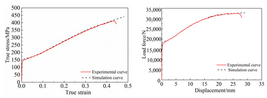 The height of the epitaxial curve depends on the error between the load force-displacement curve gained by the numerical simulation of the tensile deformation test of the arc sample and the experimental curve without considering the damage. After repeated tests, when the highest point of the epitaxial curve of the 6061 aluminum alloy is 58 MP higher than the true stress-strain curve of the experiment, the true stress-strain curve and the load force-displacement curve obtained by numerical simulation of the tensile deformation of arc sample was in good agreement with the experimental curve, as shown in Figure 3.