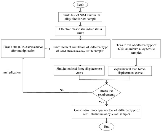 The true stress-strain data of the circular arc sample gained in the tensile experiment was used as the constitutive input of the shear sample, arc-shaped notched sample, and V-shaped notched sample, and ABAQUS finite element software was devoted to simulating the tensile deformation of 6061 aluminum alloy specimens under different stress conditions, and the load force-displacement curves of the gauge length section of the samples in the simulation results were extracted and compared with the tensile experimental curves. If the error between the simulation curve and the experimental curve is large, the true stress-strain curve needs to be corrected according to the flow chart shown in Figure 4 until the numerical simulation results and the test results are within a reasonable error range. If the error between the simulation curve and the experimental curve is small, which shows that the established tensile finite element model and the constitutive parameters of the material were reasonable, and the material constitutive parameters could be devoted to characterize the tensile deformation behavior of the aluminum alloy materials.