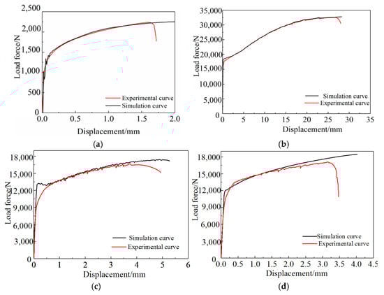 Numerical simulation of different types of 6061 aluminum alloy samples is executed through Johnson–Cook failure model and the output load force-displacement curve of the aluminum alloy sample gauge length section is compared with the experimental curve, as shown in Figure 8.