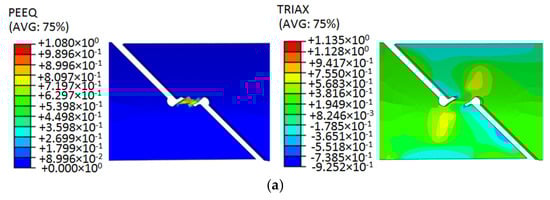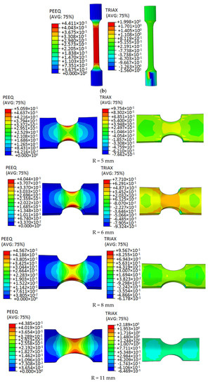 Figure 6. Equivalent strain and triaxiality stress program of the 6061 aluminum alloy samples. (a) Shear sample. (b) Circular arc tensile sample. (c) Arc-shaped notched tension sample. (d) V-shaped notched tensile sample.