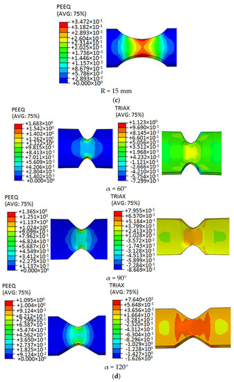 On the basis of the equivalent plastic strain and stress triaxiality nephogram of the 6061 aluminum alloy tensile specimen shown in Figure 6, we can know that the stress state of the tensile specimen had a significant effect on the fracture strain. It is obvious from Figure 6a that the distribution of equivalent plastic strain on the smallest cross-section of the shear sample was quite different, and the stress triaxiality on the smallest cross-section was the same. It is obvious from Figure 6b that the equivalent plastic strain and stress triaxiality of aluminum alloy circular arc samples were uniformly distributed on the smallest cross-sectional area. It is obvious from Figure 6c that the stress triaxiality at the root of the arc-shaped notched sample is the smallest, and the stress triaxiality near the center is larger, and the stress triaxiality decreases gradually with the increase of the notch radius. The equivalent plastic strain of the aluminum alloy arc-shaped notched sample was the largest at the edge of the notch, and the smaller it was closer to the center. It is obvious from Figure 6d that the stress triaxiality at the minimum fracture surface of the V-shaped notched sample changed with the increase of the equivalent plastic strain, and the stress triaxiality at the center part was higher than that at the edge of the notch. As the notch angle increased, the stress triaxiality of the aluminum alloy specimen showed a decreasing trend; the equivalent plastic strain of the V-shaped notched sample was the largest at the edge of the notch, and the closer it was to the center part. Based on the above analysis, it can be seen that as the stress triaxiality decreases, the equivalent plastic strain at fracture becomes larger.