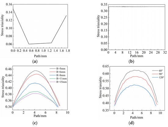 Figure 7. Stress triaxiality distribution of 6061 aluminum alloy tensile sample. (a) Shear sample. (b) Circular arc tensile sample. (c) Arc-shaped notched tension sample. (d) V-shaped notched tensile sample.