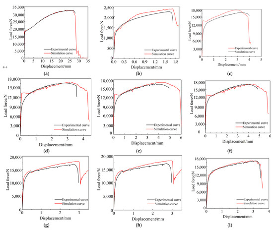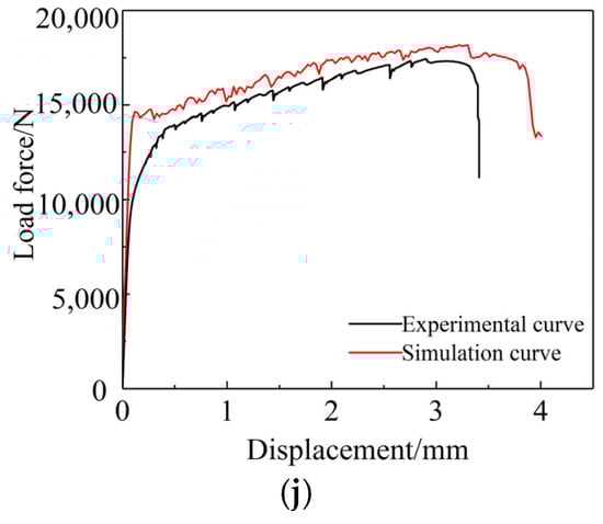 Figure 8. Comparison of experimental and numerical load force-displacement curves by Johnson–Cook failure model. (a) Circular arc tensile sample. (b) Shear sample. (c) R = 5 mm. (d) R = 6 mm. (e) R = 8 mm. (f) R = 11 mm. (g) R = 15 mm. (h) α = 60°. (i) α = 90°. (j) α = 120°.