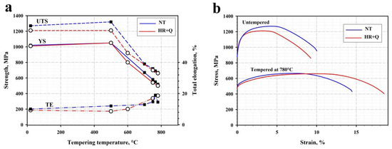 The dependences of the yield strength (YS), the ultimate tensile strength (UTS) and total elongation (TE) of the HR+Q and NT steel samples on tempering temperature are shown in Figure 2a. Both untempered HR+Q and NT samples are characterized by YS of about 1000 MPa and TE of 10%. UTS of the NT samples after tempering at T ≤ 500 °C is about 100 MPa higher than that of the steel in HR+Q condition. YS increases with increasing tempering temperature to T ≤ 500 °C and then decreases rapidly. With increasing tempering temperature from 500 to 780 °C, the difference in UTS of the HR+Q and NT samples gradually disappears. The stress–strain curves of the untempered steel samples and those tempered at 780 °C for 3 h are shown in Figure 2b. The steel samples exhibit continuous yielding behavior and TE generally increases after high temperature tempering. The observed values of YS and UTS for the NT and HR+Q samples after tempering at 750 °C are similar to those for a P92 steel (YS = 480 MPa, UTS = 700 MPa) tempered under the same conditions [34].