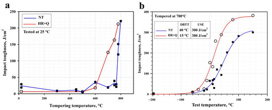 The effect of tempering temperature on the impact toughness of the NT and HR+Q samples (a) and the Charpy impact absorbed energy vs. impact test temperature curves of the NT and HR+Q samples tempered at 780 °C for 3 h (b).