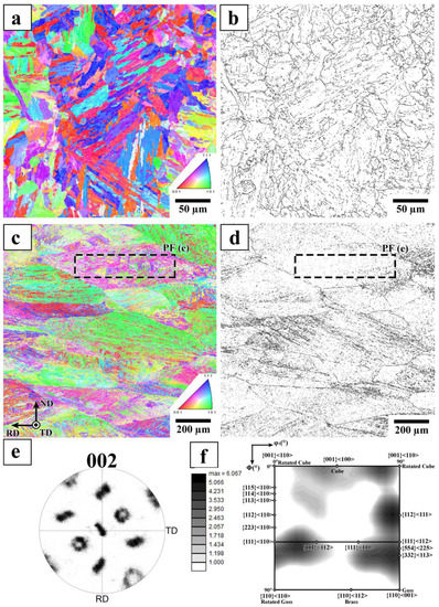 EBSD analysis of the untempered NT (a,b) and HR+Q (c–f) samples. Inverse pole figure maps for TD (a,c) and grain boundary maps showing the boundaries with misorientations between 20° and 49° to reveal PAGs (b,d). The <002> pole figure (e) and ODF (φ2 = 45° section) of the HR+Q sample (f).