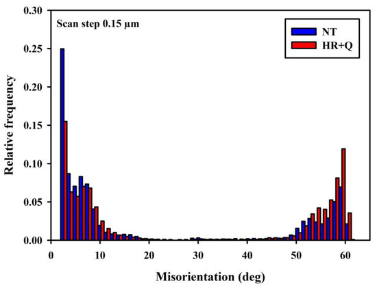 The distributions of grain boundary misorientations in the untempered NT and HR+Q samples.