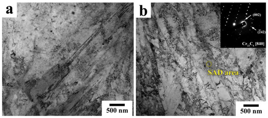 The suppressed lath/subgrain boundary migration during tempering of the steel after HR+Q treatment may be due to the pinning effect from the thermodynamically stable carbide particles. The selected area diffraction (SAD) and EDX analysis of the secondary precipitates in the untempered HR+Q sample reveal the presence of M23C6 particles with sizes ranging between 30 and 240 nm. Additionally, the precipitation of uniformly dispersed Ta-rich MX particles with the mean size of 15 nm was observed. These particles are primarily located on the dislocations in lath interiors as shown in Figure 7. It is worth noting that the mean size of the MX particles in the steel after thermo-mechanical treatment is notably smaller than that in the NT sample (Table 2). Moreover, the finer distribution of the MX carbonitrides maintains after subsequent tempering at 780 °C. The SEM images of the NT and HR+Q samples in both the untempered condition and tempered at 780 °C are given in Figure 8.