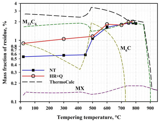 Further tempering at a temperature above 500 °C is accompanied by an increase in the total amount of the precipitate residue towards to the thermodynamically stable value. Note that the equilibrium mass fraction of the secondary precipitates including M23C6 and MX phases is calculated to be 0.35% at 900 °C. Therefore, the presence of M23C6 particles in the as-quenched HR+Q treated steel can be justified by the lower austenitization temperature (900 °C) which lies below the solvus temperature of this precipitating phase. Thus, in contrast to conventional normalizing treatment, a certain proportion of the M23C6 particles is formed during the hot-rolling process and is maintained in the steel after subsequent water quenching.