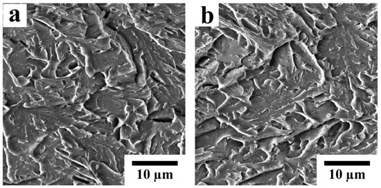 The dynamic ultimate tensile strengths of the NT sample tempered at 500–700 °C and the HR+Q sample tempered at T ≤ 500 °C are significantly lower than UTS values obtained during tensile tests. This suggests that the crack initiates without plastic deformation that is typical for the brittle fracture mechanism. The SEM fractography of the fractured steel samples tempered at 500 °C reveals the quasi-cleavage facets with a river pattern (Figure 10). The size of the facets in the HR+Q sample are slightly larger than those in the NT sample, which correlates with the difference in the sizes of PAGs and packets (Table 2), similar to the observations of Schino et al. [39]. The most common mechanism of the cleavage fracture initiation in steels involves the cracking of the inclusions or second phase particles due to plastic strain in the surrounding matrix [40,41,42]. Thus, the large packets and the presence of relatively coarse M23C6 particles in the untempered HR+Q sample facilitates the crack initiation and propagation. As a result, the fracture occurs at a lower applied load and is characterized by low adsorbed energy as compared to that for the NT sample in the untempered condition (Table 3).