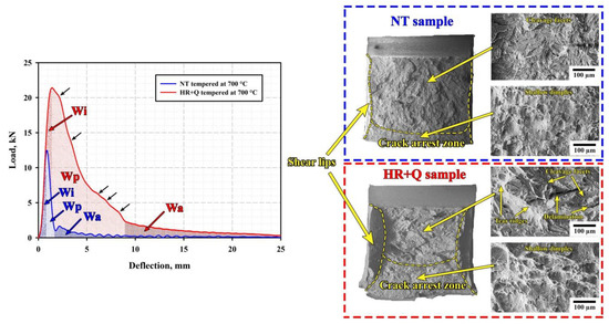 Since a significant difference in the impact behavior is found for the NT and HR+Q specimens fractured at room temperature after tempering at 700 °C, the load–deflection curves and fracture morphology are examined in this state (Figure 12).