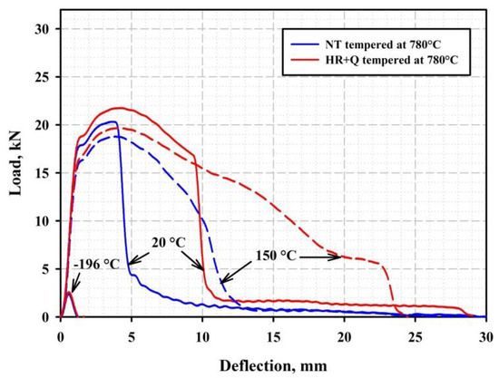 Load–deflection curves of the NT and HR+Q samples tempered at 780 °C and tested at −196, 20 and 150 °C.