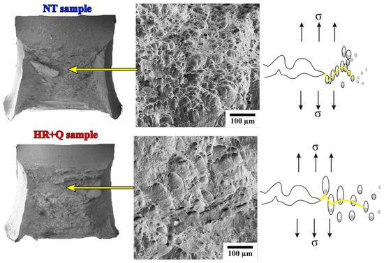 SEM images showing the fracture surface of the NT and HR+Q samples tempered at 780 °C and tested at 150 °C along with schematic illustration of the ductile crack propagation process.