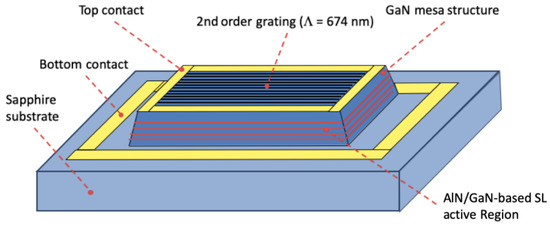 Schematic drawing of the square-shaped AlN/GaN-based inter-subband mesa with a diffraction grating on top. Metallization allows electrical contact at the top and the bottom of the mesa.