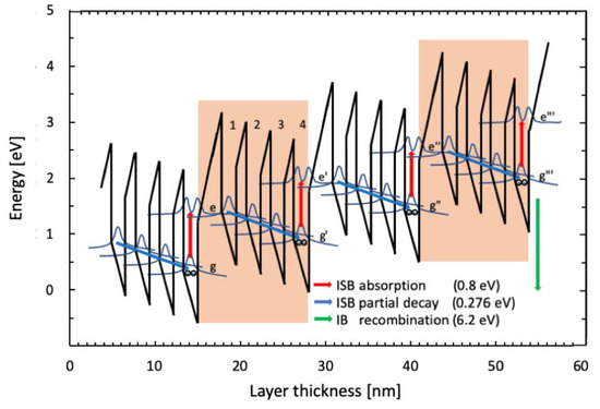 As shown schematically in Figure 3, the absorbed near-IR radiation efficiently lifts electrons from the ground level (labelled level ‘g’) into the excited QW state (labelled level ‘e’). From there, the electrons have two possibilities to proceed. They will either drop back vertically into level ‘g’ or transfer—in a second step—towards the neighboring QW (labelled level ‘1’). Due to the specifically designed multiple LO-phonon resonances of the quantum stair, this process is extremely efficient and assumed to have a higher probability than the vertical one back to level ‘g’.