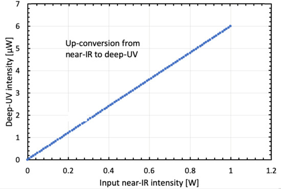 Given the previously calculated 6 µW of deep-UV power for a near-IR input power of 1 W, a linear efficiency curve can be assumed in a first approximation. Figure 4 therefore presents the deep-UV output intensity as a function of near-IR optical input power.