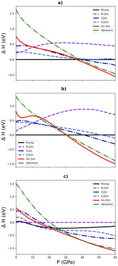 Calculated relative enthalpy vs. pressure curves, for the different possible phases (shown in Figure 1) of SbS (a), BiS (b), and SbSe (c), relative to the lowest-energy phase at ambient pressure: the Pnma phase for SbS and BiS, and the R-3m phase for SbSe.