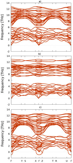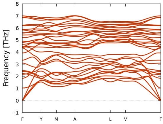 Energetic stability is a necessary, but it is not a sufficient condition for a structural phase to be synthetically accessible. One should also probe the dynamical stability of the system, which requires the study of the phonon frequencies. If imaginary frequencies emerge (as represented by negative frequencies in the phonon dispersion curves), we can analyze the results by considering that the system is at a potential-energy maximum (transient state), undergoing a phase transition, and therefore cannot be kinetically stable at the given temperature and/or pressure conditions [65,66,67,68,69,70].