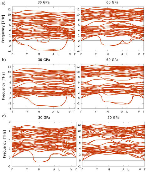 In this section, we consider the phonon properties of different phases for the three compounds, which were observed to be energetically the most favorable (Figure 2) at different pressure values, namely: