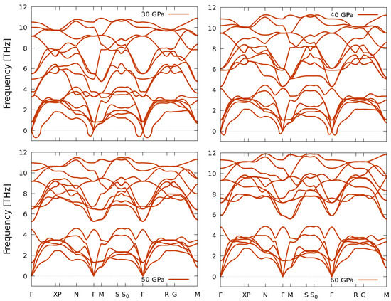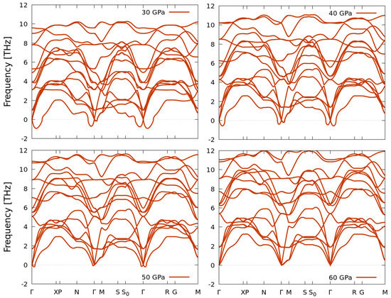 To assess the possibility of dynamical stability for the disordered Im-3m phases of the three compounds at HP, we have evaluated the phonon dispersion curves at pressure values of 30 GPa, which is close to the transition pressures observed in Figure 2; and at higher pressures of 50 (SbSe) and 60 GPa (SbS, BiS).
