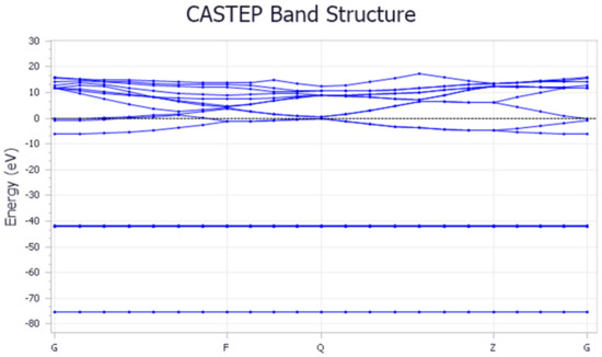 The Mg band structure has the unusual quality of being well represented by the parabolic dependence of a free-electron gas [32]. From Figure 5, the energy gap for bands between 2.0 and −2.0 eV levels at point Q is 0.659 eV. However, no band gap (E = 0 eV) exists since Mg conducts electricity. The band gap value is quite similar to the theoretical value [33] and that of previous studies [32,34]. This means that the overlapping energy in both the conduction and valence band lies at >0 eV in those band structures [35], thus indicating the Fermi level of the structure, which is the highest energy level that the electron can occupy at absolute temperature. Some of the bands merge at point (Q, 8.85 eV). This might be the energy level of the overlapping conduction and valence bands.