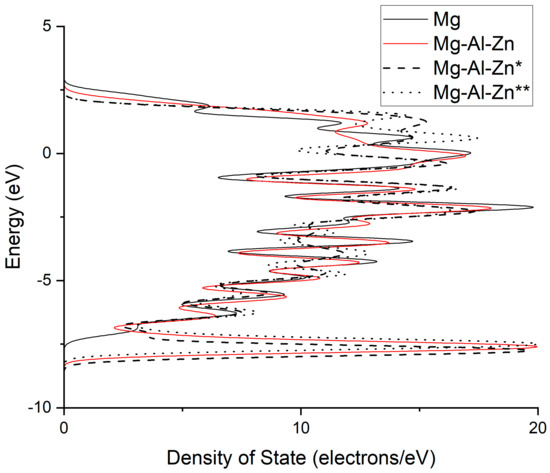 The density of states of Mg, Mg-Al-Zn, Mg-Al-Zn*, and Mg-Al-Zn**.