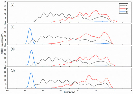 To determine the contribution of individual atoms in this structure, the partial DOS data for all four Mg and Mg-Al-Zn (Figure 8) were plotted. The black, red, and blue colours represent PDOS of s-, p-, and d-orbitals, respectively. Since the PDOS graph in the s-orbital shows nearly similar behaviour for all four molecules, the d-orbital states were detected in most structures at the range of −6 to −9 eV with a PDOS value of almost 20 electrons/eV, except for Mg. This is due to the presence of Zn atoms. A previous study [20] showed similar results for the d-orbital PDOS value in Mg-Zn and Mg-Al structures. However, the differences may be seen in the p-orbital graph. This is because of the different position of Al and Zn. In this figure, Mg exhibits the highest p-orbital peak around 0 eV. Some prominent peaks were observed in the range of 0.5–1.5 eV in Mg-Al-Zn, Mg-Al-Zn*, and Mg-Al-Zn**. The highest p-orbital peak in Mg-Al-Zn** lies in the energy range of −0.5 to −1.0 eV.