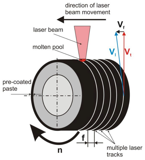 The scheme of laser boriding with pre-coated paste—the method of multiple laser tracks producing vf—feed rate; vl—scanning rate; vt—tangential speed; n—rotational speed; f—distance between the axes of adjacent tracks.
