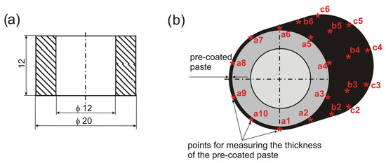 The shape and dimensions of the specimens used for laser boriding (a) and the scheme of the specimen with marked points for measuring the thickness of the pre-coated paste (b).
