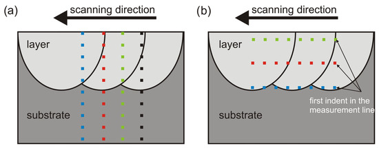 The scheme of the location of measurement points used to prepare microhardness profiles: (a) measurements along the straight lines perpendicular to the top surface; (b) measurements along the straight lines parallel to the surface.